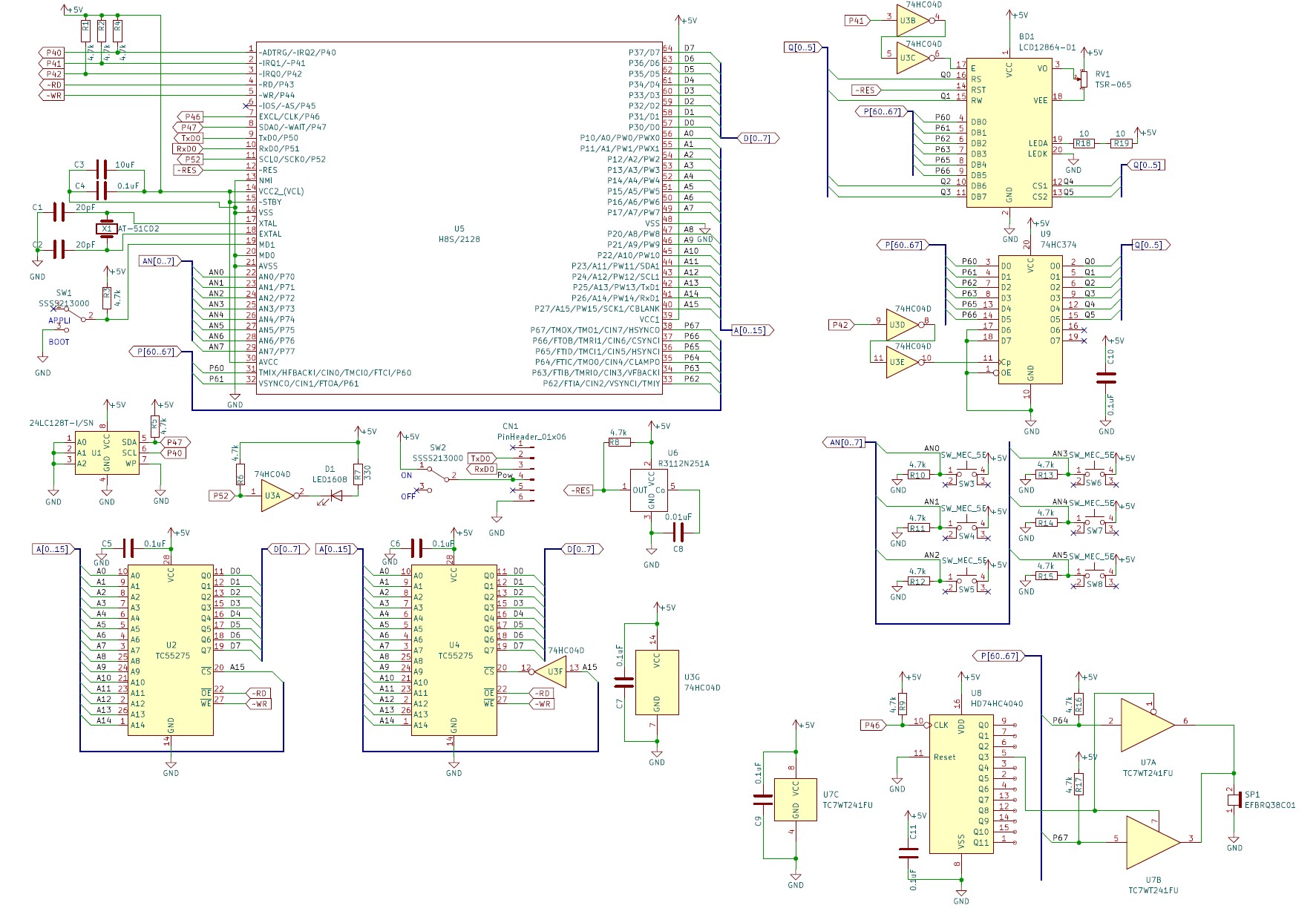 部品番号 名称 D1 チップLED サイズ1608 ⇒【115109】青緑色チップLED 1608 OSG30603C1E など C1,2 20pF50V サイズ1608 C3 10uF10V サイズ3216 C4~C7,C9~C11 0.1uF50V サイズ1608 C8 0.01uF50V サイズ1608 R1~R6,R8~R17 4.7kΩ サイズ1608 R7 330Ω サイズ1608 R18,R19 10Ω サイズ1608 U1 24LC128T-1/SN U2,U4 TC55257 U3 74HC04 U5 H8S/2128 オークション出品 U6 R3112N251A U7 TC7WT241FU U8 74HC374N U9 74HC4040 BD1 LCD12864-D1 グラフィックドットマトリックス LCD モジュール VR1 【106063】半固定ボリューム 10kΩ [103] SP1 EFBRQ38C01 圧電スピーカー ⇒代替品 【101251】圧電スピーカー(圧電サウンダー) PT08 SW1~2 SSSS213000 アルプススライドスイッチ SW3~8 【P-03649】タクトスイッチ(水色) ~ 【114372】六角ナット M3×0.5 ~ 【107320】六角オネジ・メネジ MB3-15 ×8個 ~ 【115889】六角ナット M2×0.4 ~ 【115887】なべ小ねじ(+) M2×5 ~ 【117017】USBケーブル USB2.0 Type-Aオス⇔Type-Cオス 0.5m ~ 【K-14745】CH340E USBシリアル変換モジュール Type-C(CN1に接続)